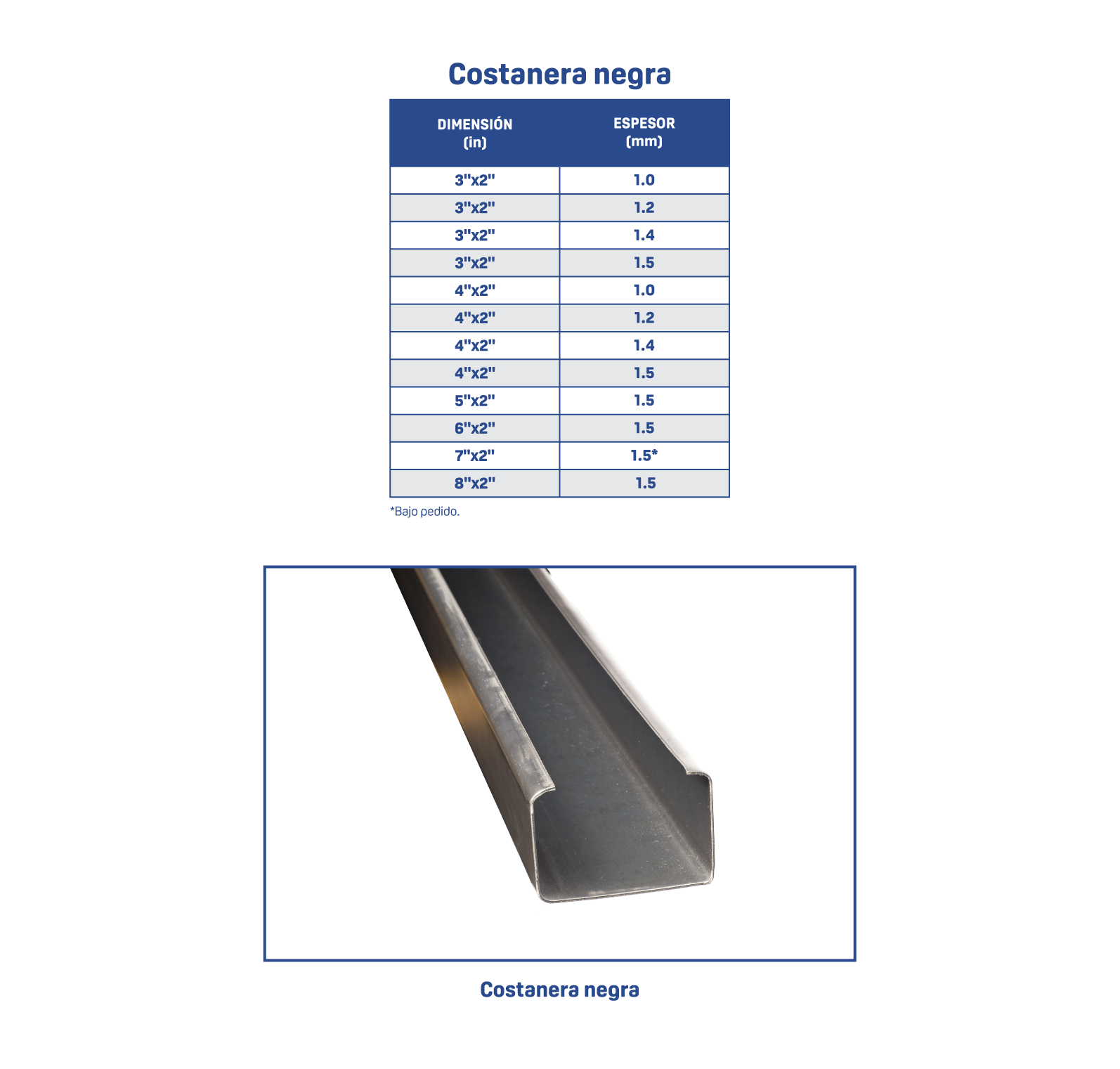 También llamada Perfil en C, Polin o Canaleta. Se utiliza como materia prima lámina de acero rolada en caliente en 4 espesores:1.0 mm, 1.2 mm, 1.4 mm y 1.5 mm. La longitud en estos espesores es de 6 metros con sección tipo C. El proceso de fabricación para producir costanera es de laminado en frío.