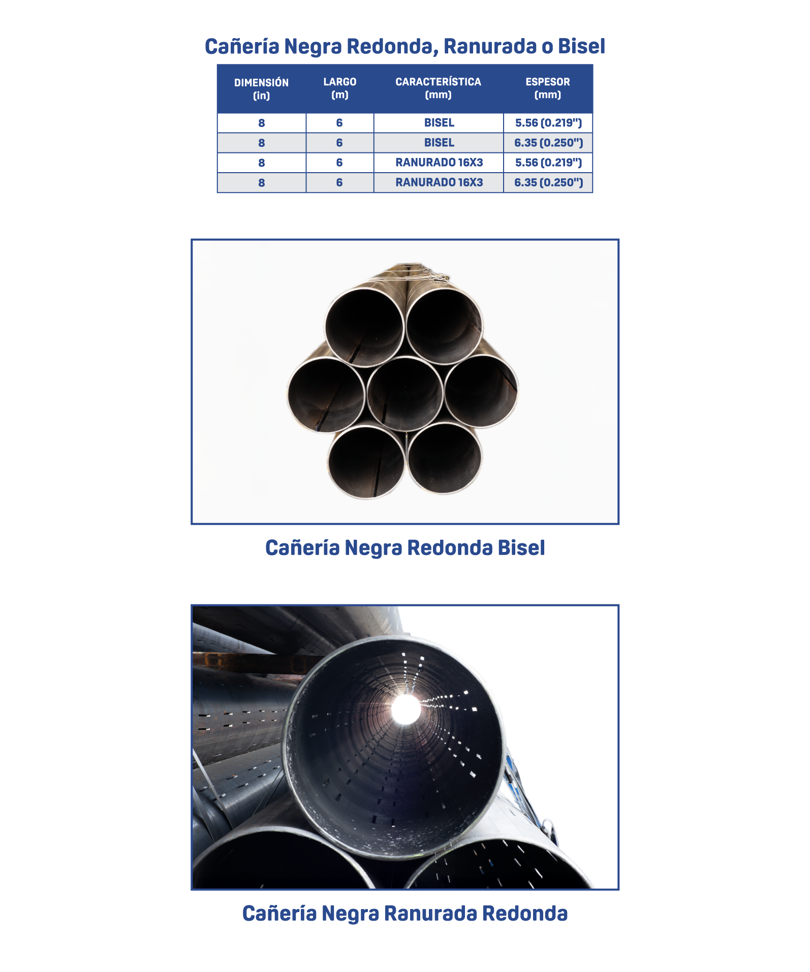 Fabricada a partir de lámina de acero al carbono rolada en caliente, esta cañería está diseñada para sistemas de captación y filtración subterránea donde se requiere cañería con ranuras y bisel, permitiendo el paso controlado de agua mediante ranuras longitudinales. Es común en perforación de pozos y aplicaciones que requieren conducción hidráulica y protección estructural. Se produce a partir de caños soldados longitudinalmente, siguiendo los lineamientos de la norma ASTM A53/A53M, Grado A. Las piezas con bisel incluyen prueba hidrostática; las ranuradas, no.
