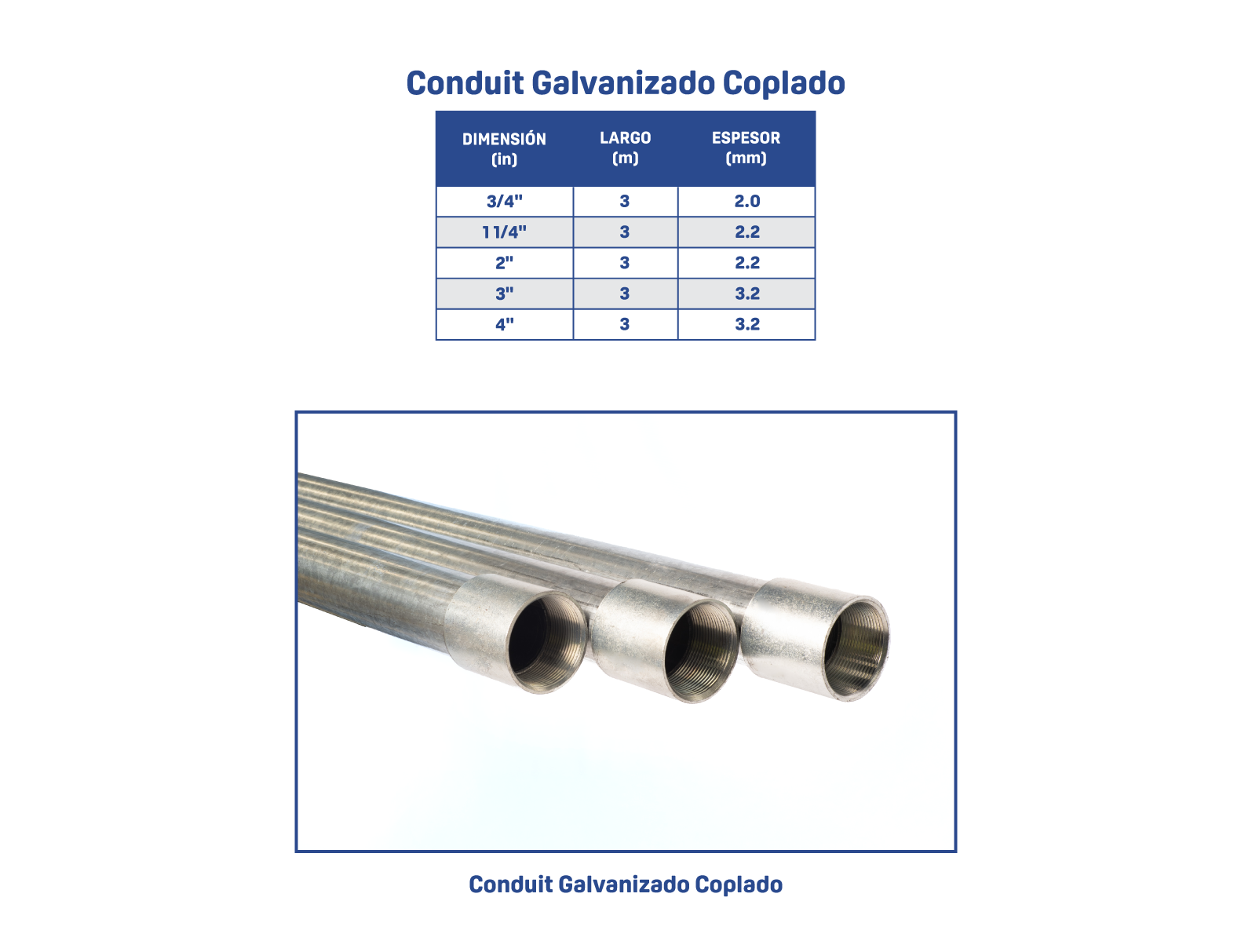 Tubería diseñada específicamente para la protección de cables eléctricos, fabricada a partir de lámina galvanizada con recubrimiento de zinc de 120 g/m² para espesores menores o iguales a 1.5 mm, y 180 g/m² para espesores superiores a 1.5 mm.