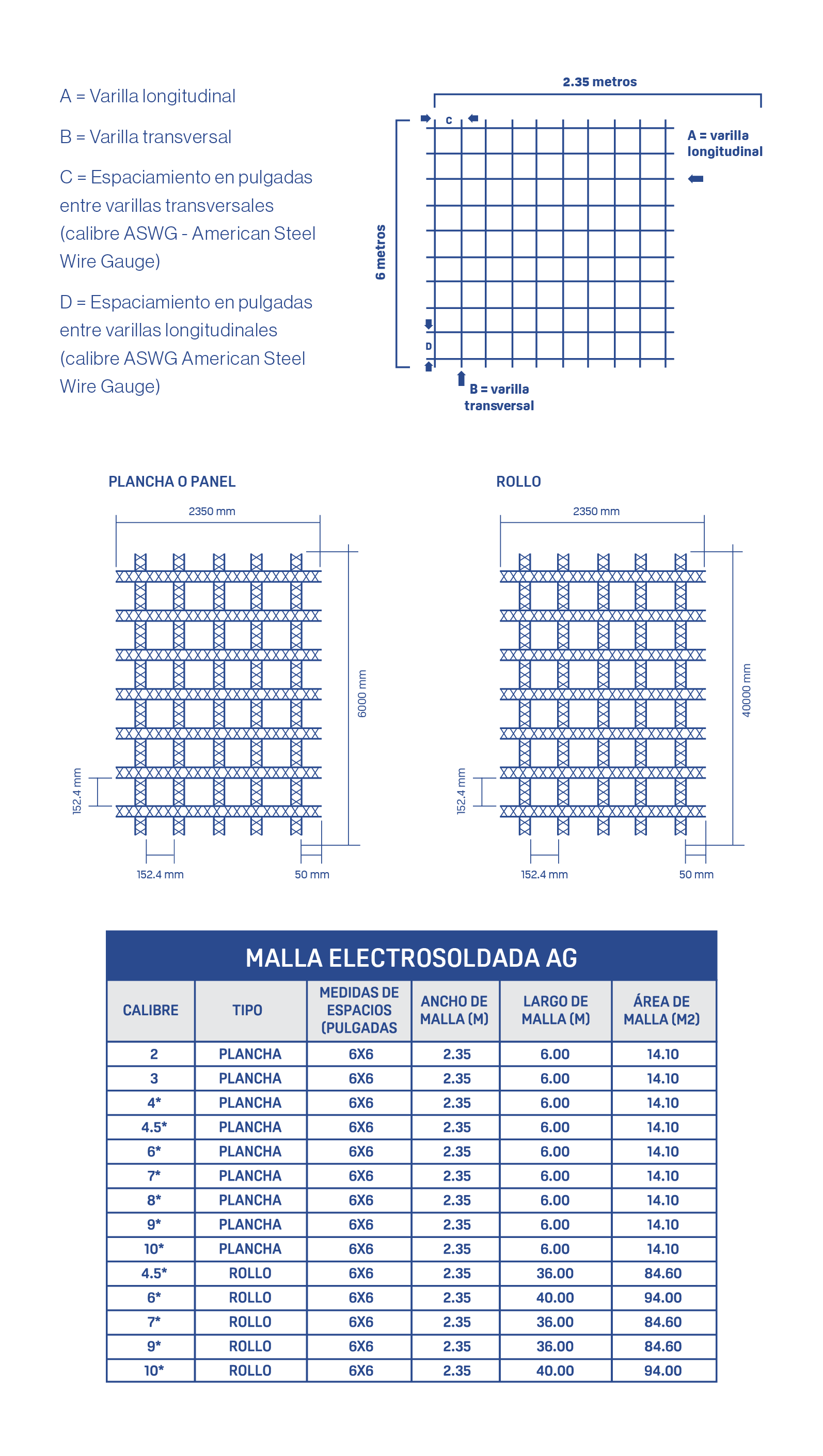 Es fabricada conforme a las normas ASTM-A1064, NTG 36017, INTE-C 402:2020 y RTCR 452:2011 con alambre laminado en frío corrugado, de calibres: 10, 9, 8, 7, 6, 4.5, 4, 3 y 2. Contamos con presentaciones de rollos de 36 y 40 metros y en planchas (panel) contamos con la presentación de 6 metros de largo x 2.35 m de ancho. Su principal función es como soporte adicional de toda la estructura, sin embargo, se coloca en los puntos que necesitan más apoyo. Se utiliza como malla de refuerzo encima de los muros o alrededor de las columnas y edificaciones. Por su resistencia a la corrosión y oxidación, es ideal para cercar huertos y zonas agrícolas. Sus principales usos son en la fabricación de viviendas, tuberías de concreto, diques, túneles, concretos proyectados, canales de riego, armaduras inferiores y superiores de losas, pavimentos, escaleras, muros y más.