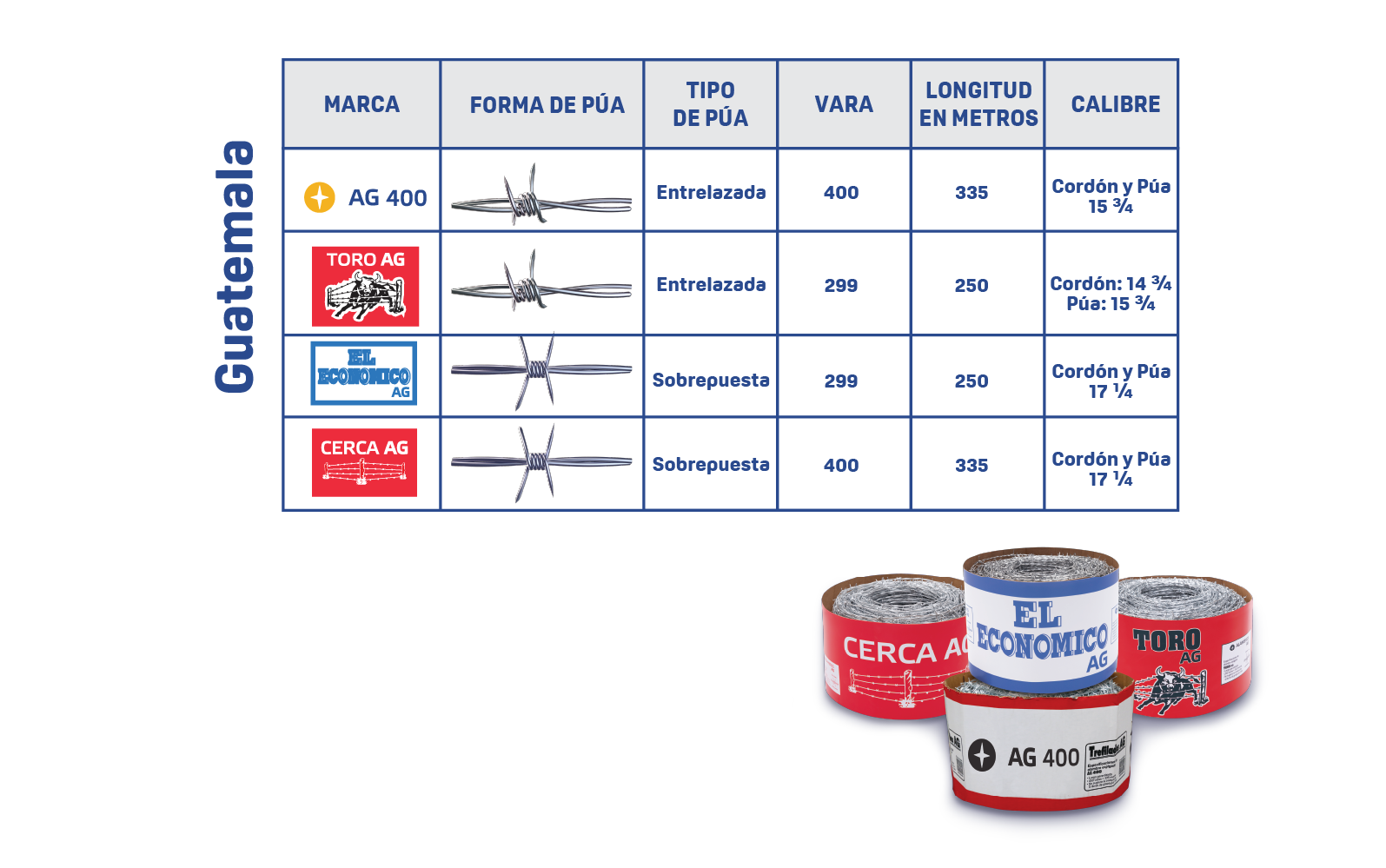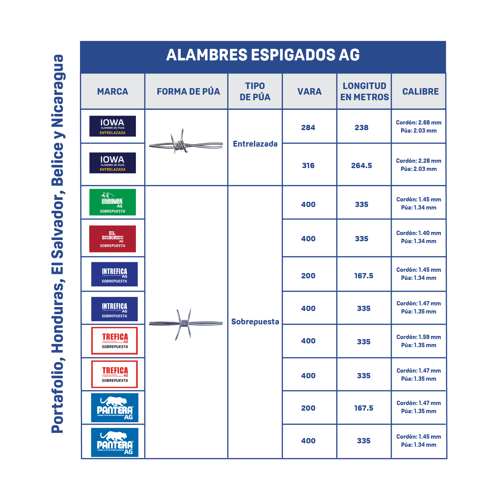 El alambre espigado o de púa está conformado por cuatro hilos, dos entorchados de alambre galvanizado, con púas espaciadas uniformemente a lo largo del mismo. Los diferentes tipos de alambres espigados son utilizados principalmente en la construcción de cercos para la protección de ganados y otras tareas agrícolas, así como diferentes aplicaciones de obra civil.
