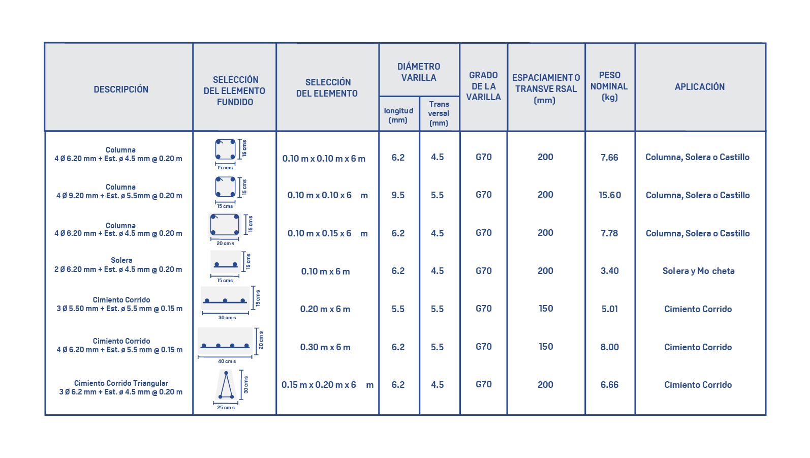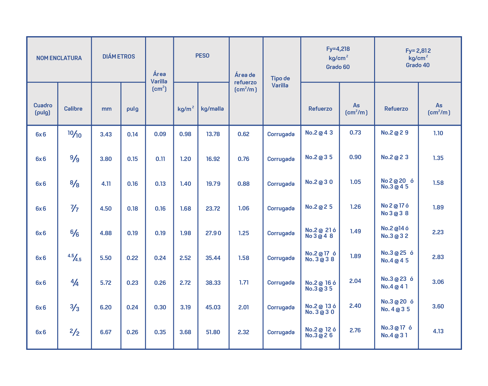 • 16 varillas longitudinales • 40 varilla transversales • 2.35 metros de ancho x 6 metros de largo • 14.10 m de área bruta • Cuadros de 15 x 15 cm. (6”x 6”) • Varillas electrosoldadas en sus intersecciones