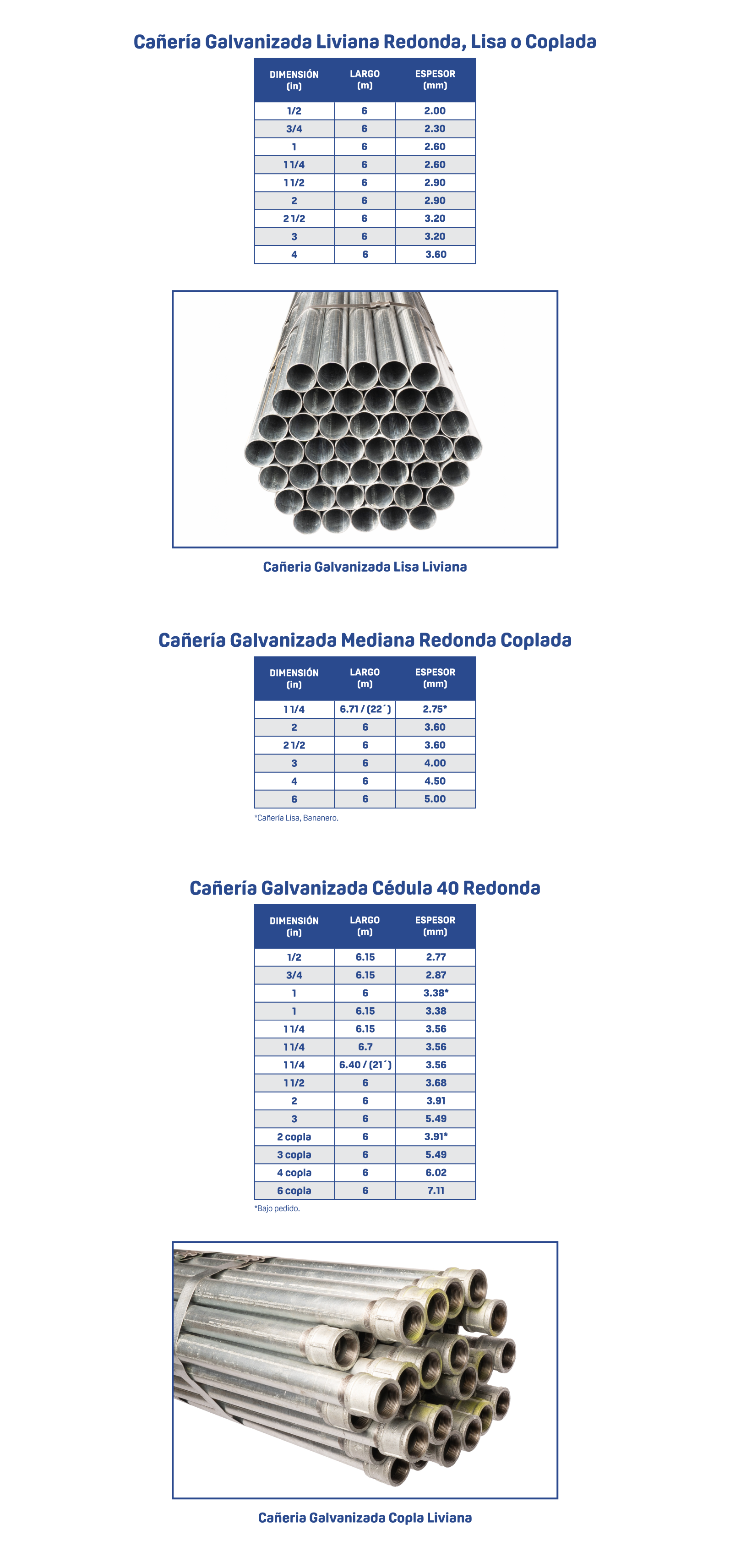 La cañería galvanizada cuenta con un recubrimiento mínimo de 360 g/m² de zinc para las clases ligera y mediana, mientras que para la cédula 40 se aplica un recubrimiento mínimo de 490 g/m². Grado A, con prueba hidrostática. Este recubrimiento brinda protección contra la corrosión, extendiendo significativamente la vida útil del producto. Está diseñada para aplicaciones en conducción de fluidos, como agua y aire a baja presión. Se suministra en tramos estándar de 6 metros, con extremos lisos o roscados (rosca NPT), según requerimiento. La copla utilizada varía según el tipo de cañería.