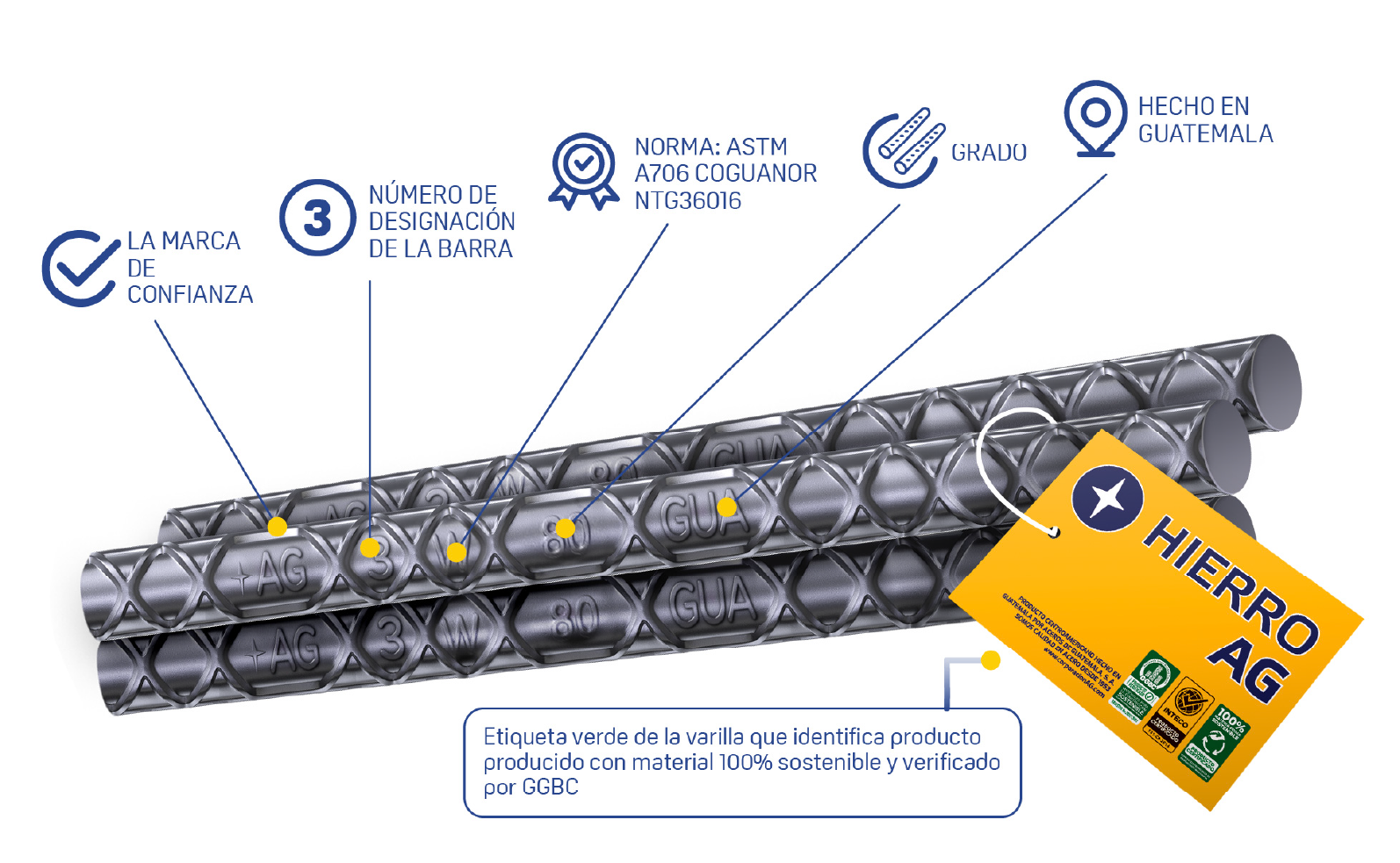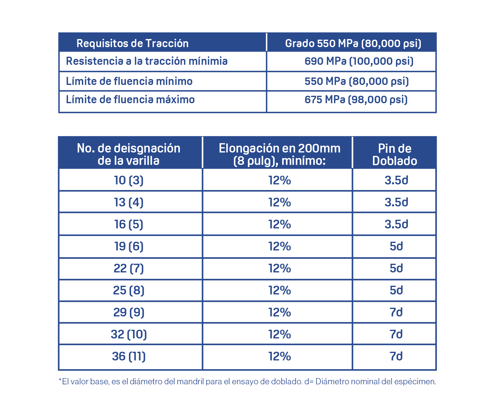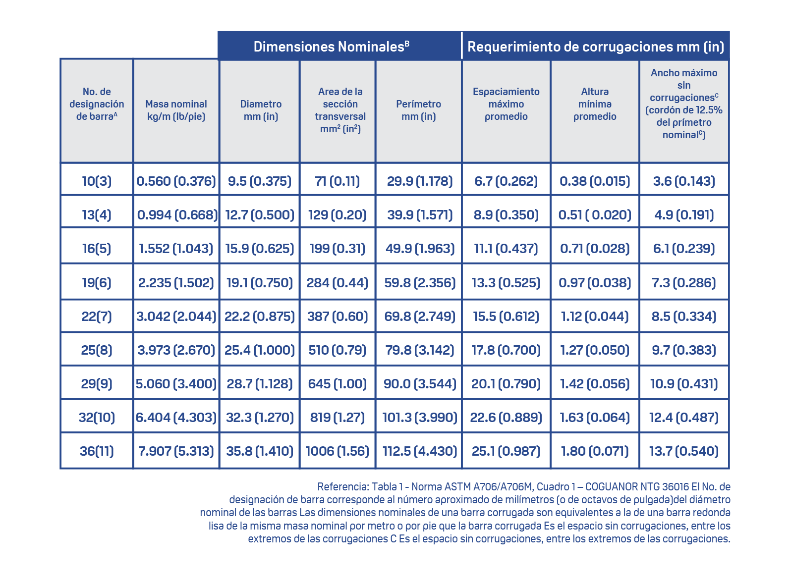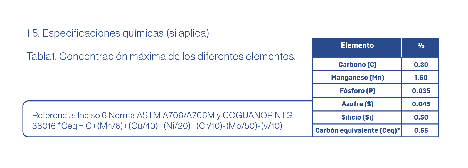 ASTM A706/A706M: Standard Specification for Deformed and Plain Low-Alloy Steel Bars for Concrete Reinforcement; COGUANOR NTG 36016: Barras de acero, de baja aleación, lisas y corrugadas para refuerzo de concreto.