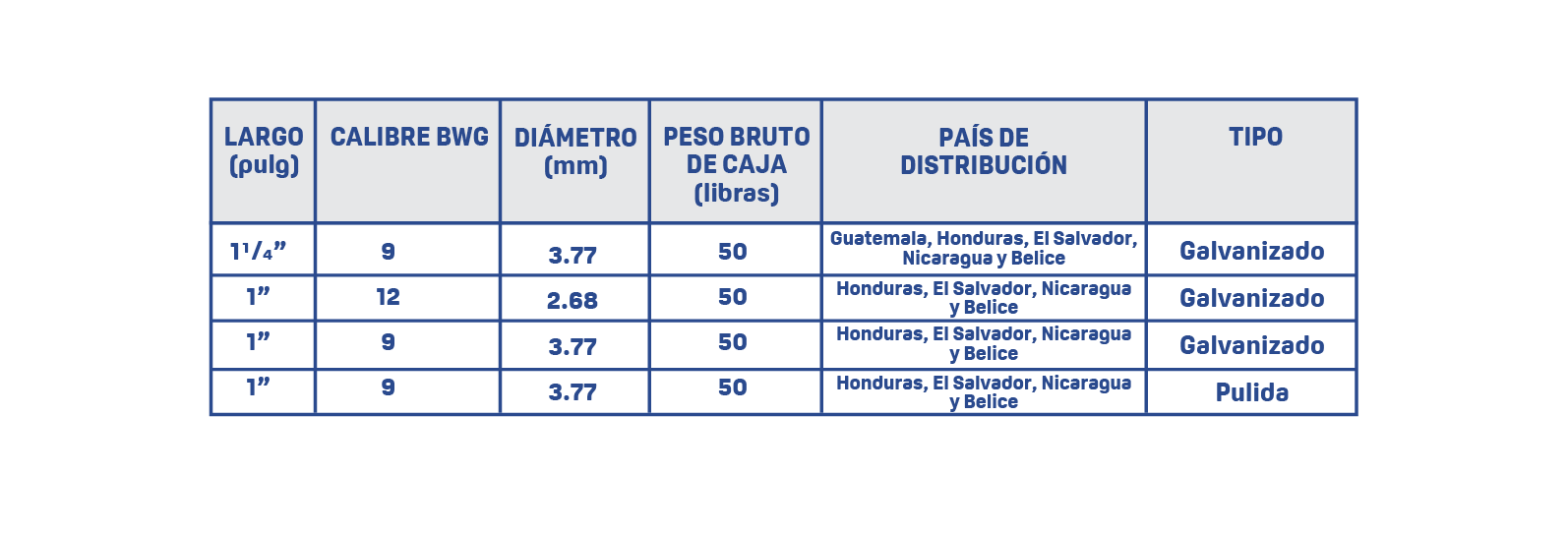 Se fabrica a partir de alambre galvanizado y/o hierro de baja aleación. Se utiliza para fijar el alambre espigado a los postes de madera. Proporciona seguridad ante la corrosión y buen agarre derivado del alambre galvanizado y la muesca a lo largo de su cuerpo. La muesca aporta mejor adherencia a la superficie porosa de la madera en cualquiera de las dos presentaciones (galvanizada o pulida).