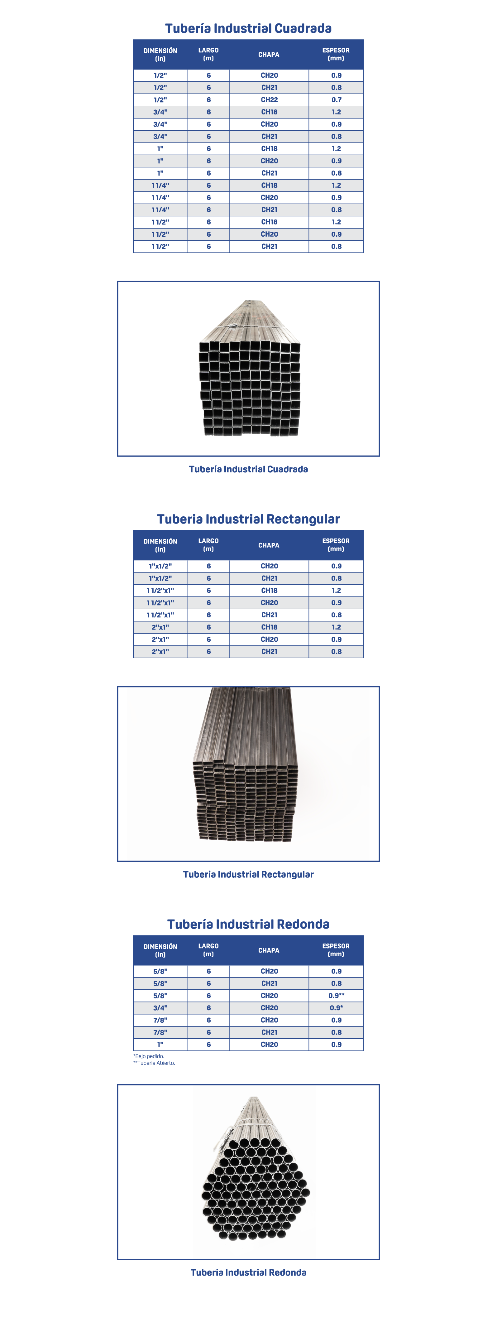 Debido a su acabado superficial limpio y uniforme, la tubería industrial es ampliamente utilizada en herrería decorativa y funcional, como en la fabricación de muebles metálicos, barandas, estructuras ligeras y aplicaciones de herrería fina en general. Fabricación: Esta tubería se fabrica a partir de lámina de acero al carbono rolada en frío, lo que le otorga una mejor precisión dimensional, acabado superficial más liso y mayor resistencia en aplicaciones no estructurales. Se produce en tres secciones: cuadrada, rectangular y redonda, en longitudes estándar de 6 metros por unidad.