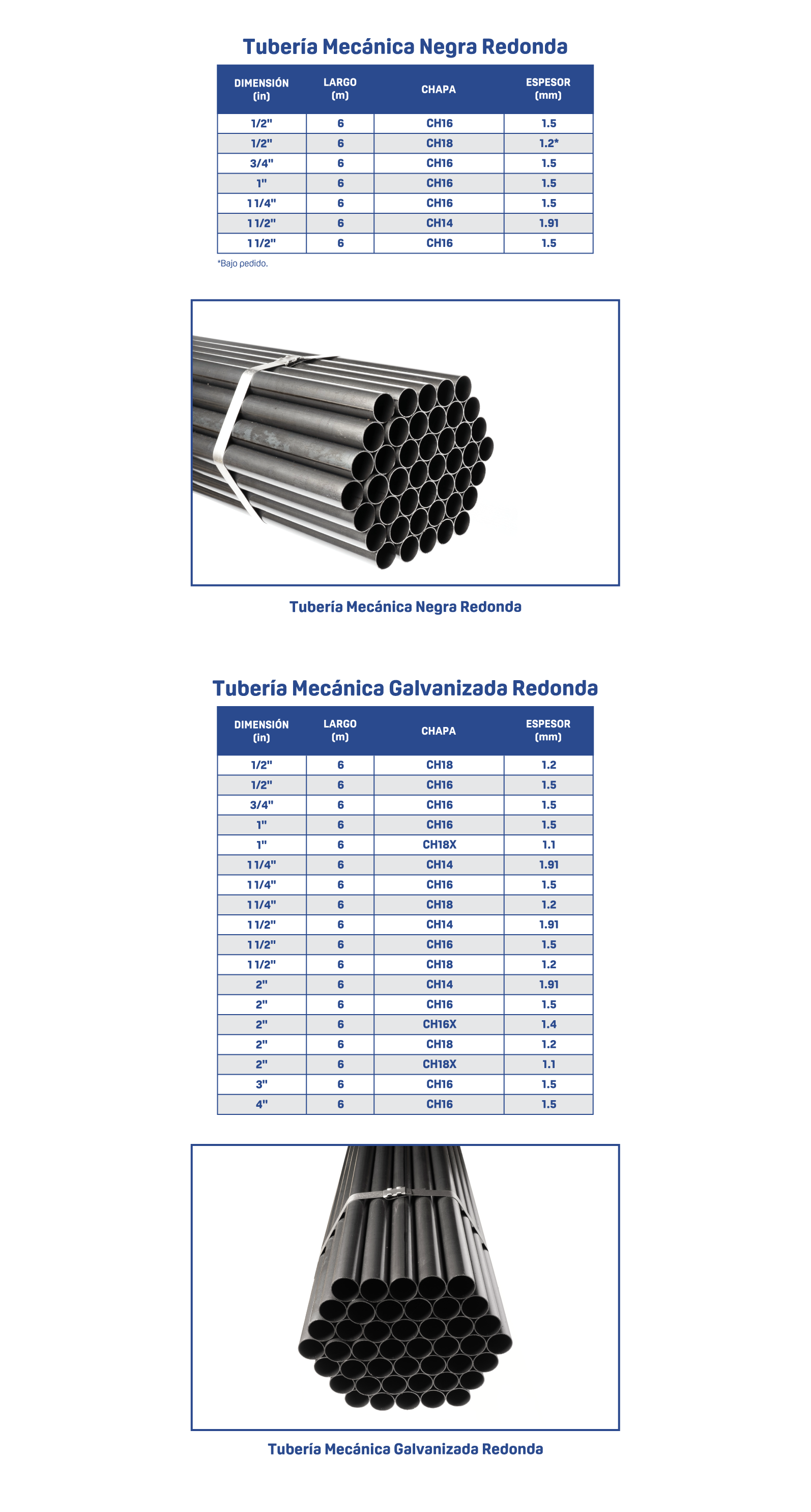Para la fabricación de estructuras de cercos, alumbrado público, rejas, pasamanos y herrería en general. Su forma es redonda. La tubería mecánica negra es fabricada con lámina de acero rolada en caliente, Grado A, en tubería galvanizado por inversión Grado A, mientras que la tubería mecánica galvanizada es fabricada a partir de lámina previamente galvanizada, no aplica grado con un recubrimiento de zinc de 120 g/m2 para espesores menores o iguales a 1.5mm y 180 g/m2 para espesores mayores a 1.5mm. Esta tubería se fabrica con un largo estándar de 6 metros.